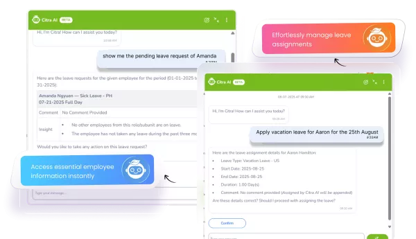 AI assistance (Citra) — employees can request/approve leave by chat, check balances, and soon get team-aware planning suggestions that minimize coverage gaps.