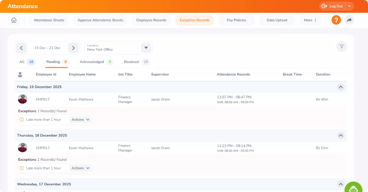 The Solution - OrangeHRM 8.0 solves this with Punch-In and Out Reminder Notifications. Employees receive timely alerts via email or the mobile app if they miss a scheduled punch. Furthermore, our new Attendance Record Exception Management flags anomalies in real-time. Instead of relying on manual timesheet audits, the system proactively detects critical deviations such as Late Arrivals, Incomplete Attendance, and Missing Records based on predefined rules. HR Admins maintain full control through flexible Exception Rule Configurations, allowing for tailored compliance logic that adapts to unique team structures and schedules. These flagged events are aggregated in a centralized UI called Exception Records, where Supervisors can take corrective actions to resolve issues. OrangeHRM 8.0 further breaks down data silos with its new Cross-Module Reporting support, seamlessly synchronizing Attendance data with the Employee Management and Leave Management modules. This integration allows administrators to generate unified reports that pair real-time attendance fields with demographic and leave records for a holistic view of workforce productivity.