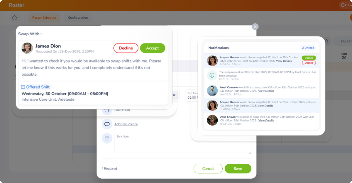 Shift Swaps - Employees can now request swaps with eligible co-workers directly.